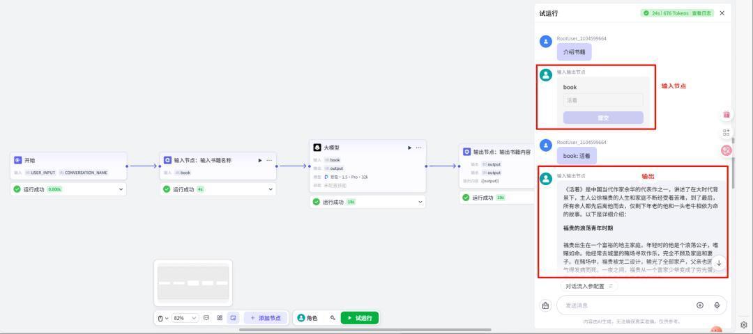 用户进行输入时,对话框中会出现输入节点的提示框,提示用户需要输入的内容“book”,用户输入后,智能体将输出运行的结果